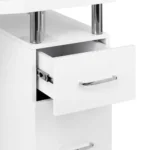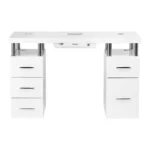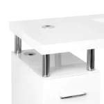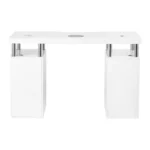 Kozmetična miza Sync z integriranim zbiralnikom prahu je sodobna izbira za profesionalne salone, kjer štejeta udobje in brezhibna organizacija. Minimalistična oblika in visok sijaj delovne površine ustvarjata eleganten vtis in povečujeta udobje pri vsakodnevnem delu.